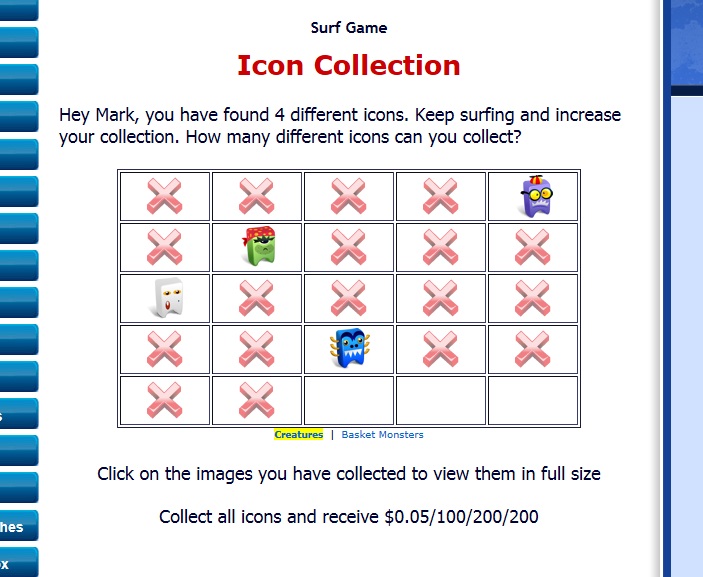 A random icon is shown in the top surf bar every N random number of pages defined by admin. In admin panel statistics are available to monitor members collecting icons