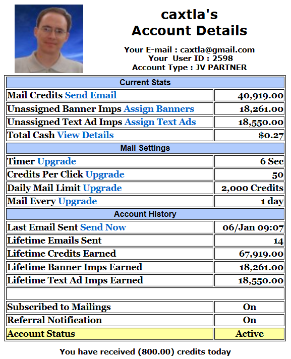 Show a Member Account Overview in your member area, including member account information, gravatar image, unassigned credits, banner and text ad impressions, cash status, membership settings, lifetime email sent, lifetime credits earned and credits earned during the day